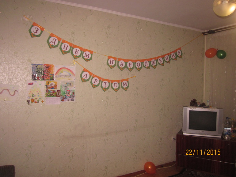 Далее - растяжка "С днем рождения Артем", тут все просто, нашла подходящий шаблон, вписала нужные буквы, распечатала на обычной бумаге, приклеила на картон для большей плотности, проделала дырочки и протянула через нее ленточку