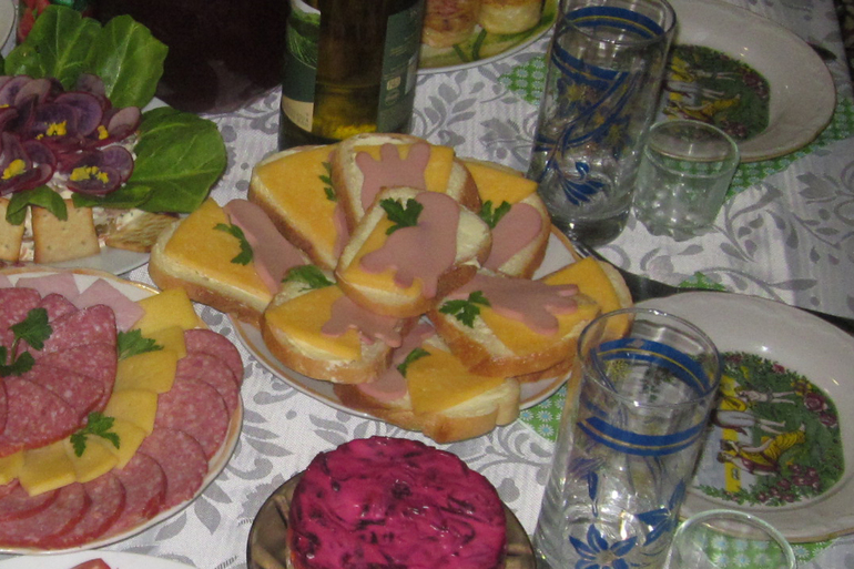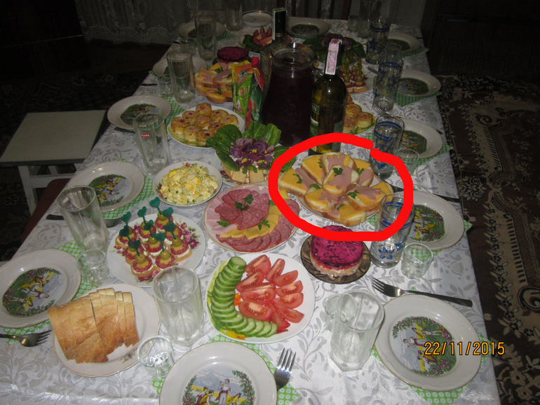 На столе для взрослых ничего такого необычного не было, разве что бутерброды, если приглядеться, то видно, что колбаска нарезана в виде следа динозавра.