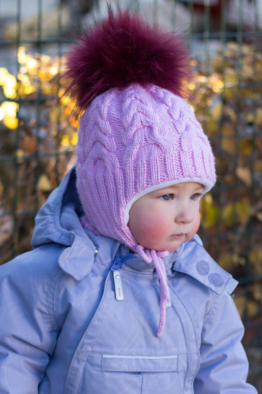 Первая шапка Ализе Бэйби Вул, в две нити, ушло ровно два моточка, подклад флис, помпон на кнопке