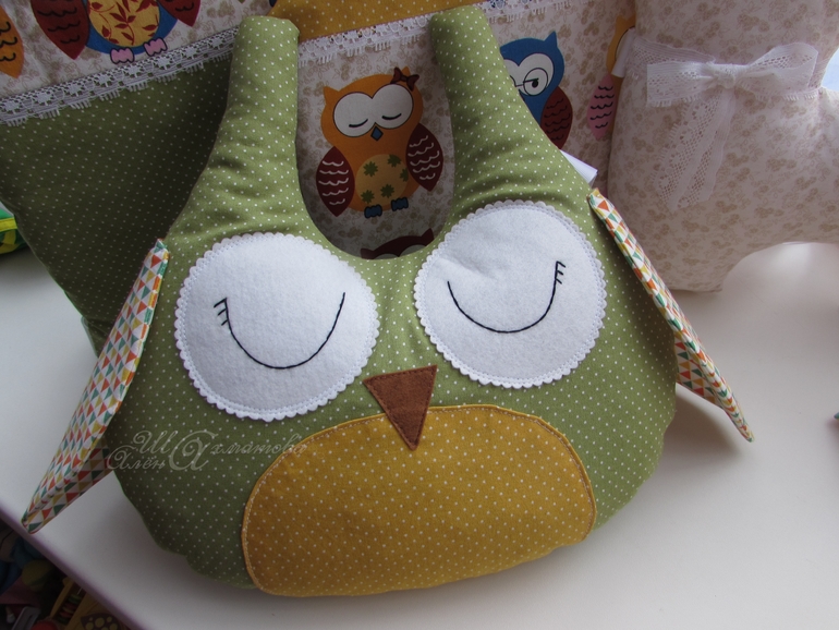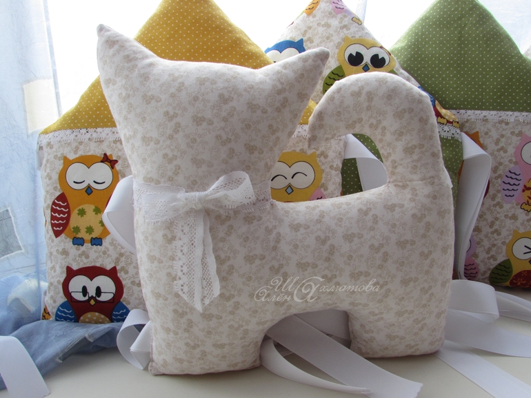 Использовала корейский хлопок, репсовые ленты и кружева. Наполнитель - холлофайбер. У совушек глазки и клювики из фетра. Размер домиков 30 х 35 см, размер совушек и котенка 30 х 30 см.