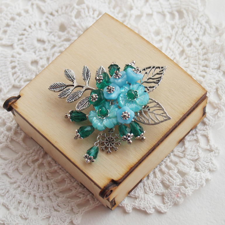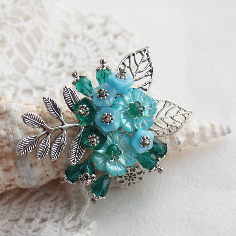 Брошь в красивых изумрудно-бирюзовых тонах! Собрана из перламутровых резных цветов, стеклянных капель и бусин и чешских цветов. Украшена символом зимы - снежинкой :)