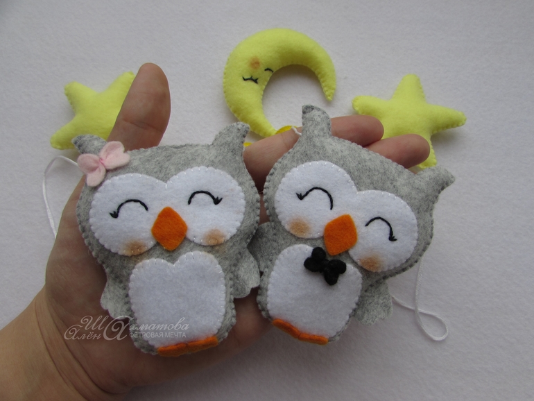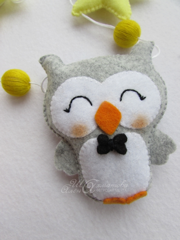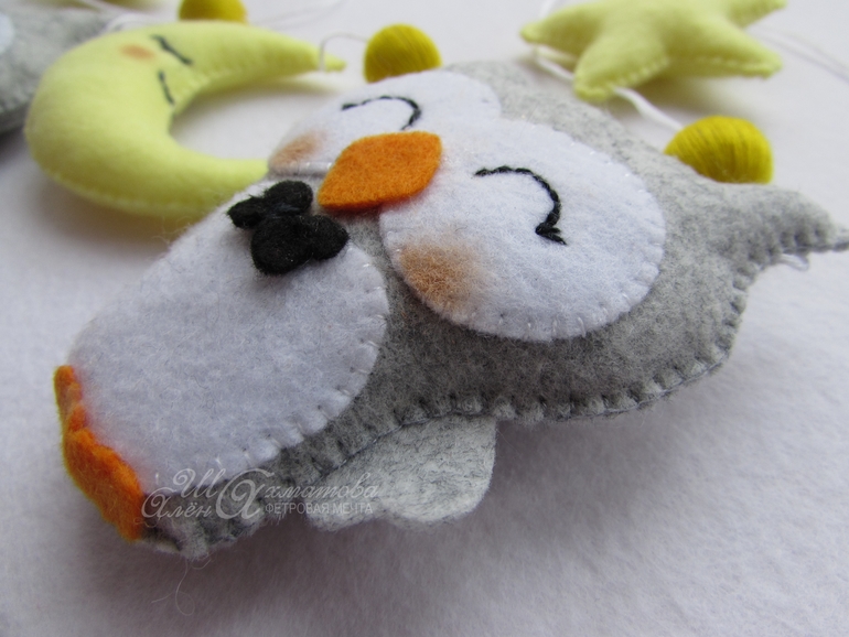 ФетрПо мастер-классу от Марии ("Расчудесье" на ЯМ) сшилась у меня вот такая гирлянда для детской кроватки или комнаты с парочкой совят, звездочками и месяцем!