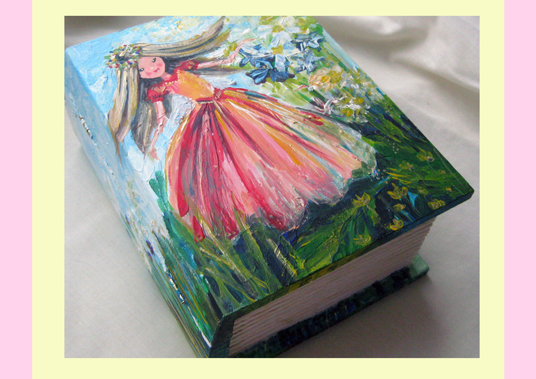 Сначала хотела просто купить в магазине, но потом решила что необходимо сделать своими руками. Купила деревянную заготовку в леонардо в виде книжки и решила расписать. Загрунтовала для начала, затем взяла акриловые краски и стала что-то рисовать, сама определенно не понимая что рисую, но первые штрихи были похожи на девочку в платье и рисунок стал постепенно проявляться. В итоге вышла девочка среди цветочного сада.