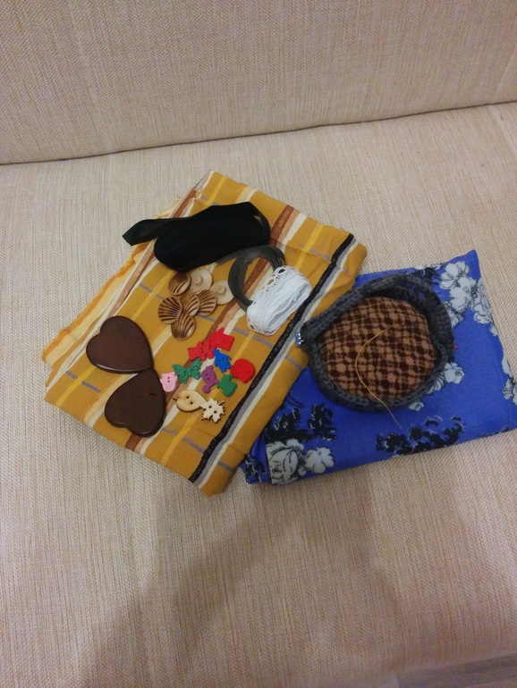 Два отреза тканюшки. Состава не знаю(( но точно не хлопок. Две ленточки. Косая бейка. Пуговички все деревянные. И корзиночка- игольница в моём исполнении.