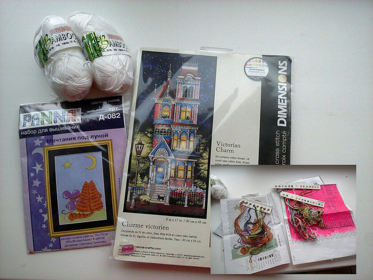 ОСТАТКИ наборов "Викторианский шарм" от Дим и "Мечтания под луной" от ПАННА. Домик на схеме весь под розовым маркером, но читабелен для сопоставления ниток, нитки есть всех цветов. Схема к мини-набору чистая, все нитки также имеются для подбора. + 2 моточка бамбуковой пряжи белого цвета!