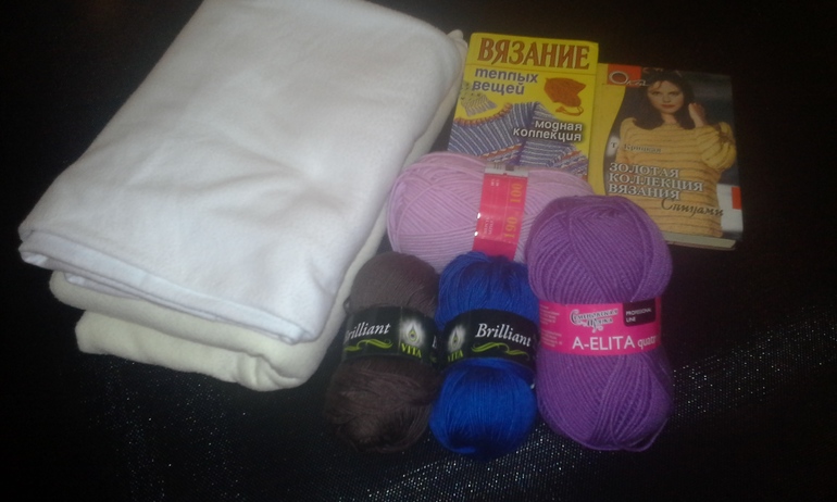 2 слоник: 2 книги по вязанию , 2 отреза флиса 1*1м белого и кремового цвета , по 2 мотка пряжи :Семеновская пряжа Аэлита кватро ( светлый и темный фиолет 100гр 190 м шерсть 60 проц и акрила 40 проц) ; Вита Бриллиант .( синяя и коричневая 100 гр 380 м 45 проц шерсть ластер и 55 проц акрила)