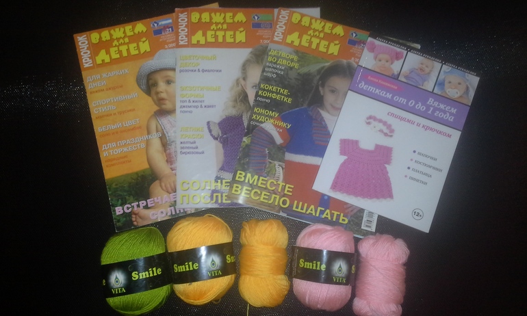 1 слоник: 3 журнала Вяжем для детей( крючок) ;книжка Вяжем деткам от 0 до 1 года(спицами и крючком) а также 5 мотков пряжи Вита Смайл ( 50 гр 225 м 30 проц шерсть мериноса,5проц шелка и 65 проц акрила): 2 розовых, 2 желтых и 1 зеленый!