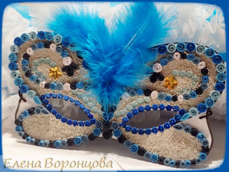 Объявили у нас в школе конкурс: "Новогодняя маска своими руками". Думали мы думали и наконец придумали. Вспомнили, что у дочки есть красивая голубая юбочка и решили все это дело обыграть.На компьютере распечатала маску бабочки, при помощи утюга приклеили клеевую с изнаночной стороны и работа закипела. Вырезали глаза.Обклеили их пайетками. Роллы крутили вместе, микро бисер засыпала на клей ПВА я. Получилась вот такая маска "Вlue butterfly", на наш семейный взгляд, очень даже неплохо.