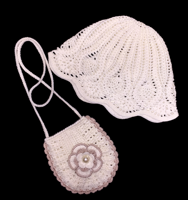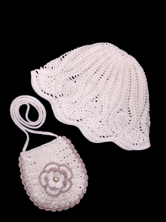 Пряжа сосо молочного цвета (ушло около 2 мотков) панама в одну нить, сумочка в две ниточки.