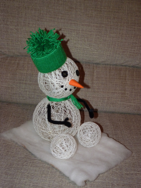 Спасибо) сначала на воздушные шарики наматывала нитки с клеем, когда высохли, шарики лопаются и вынимаются, потом просто все склеивала, наклеила пуговки глазки и ротик, носик из конуса и ниток, и "одела" в шапочку и шарфик