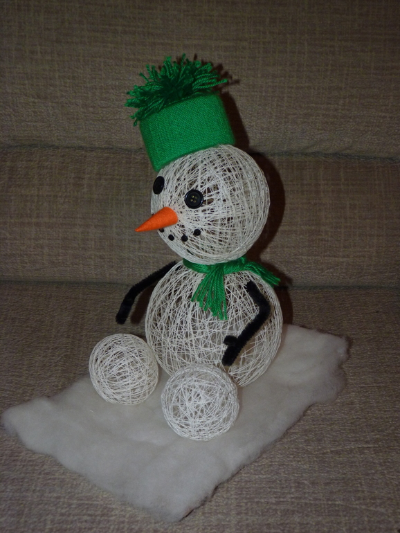 Поделки с детками.Мы в этом году тоже "лепили" снеговика в садик) Кирюша помогал на первом этапе, вместе наматывали нитки на шарики, измазались все клеем, зато было весело) Собирала я снеговика уже самостоятельно. Вот такой зимний житель у нас получился для садика