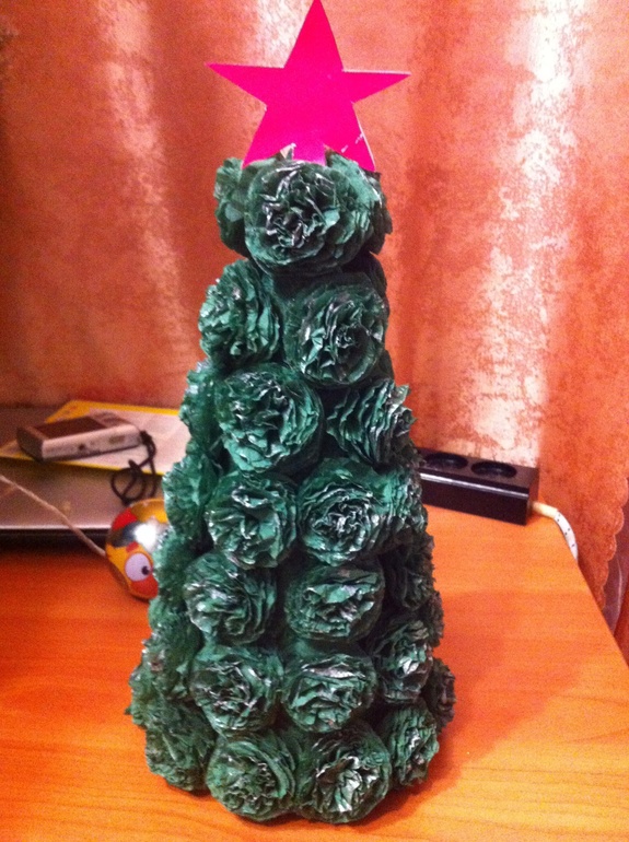 Поделки с детками.Конечно хотелось бы мне понаряднее, изначально планировала украсить бусинками, но некогда даже идти в магазин за ними. Ёлка сделана из салфеток, сделали за один день и на следующий день понесли её уже в школу. Посеребрила её немного серебристым лаком.