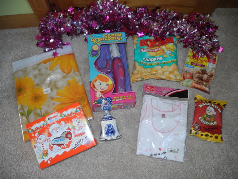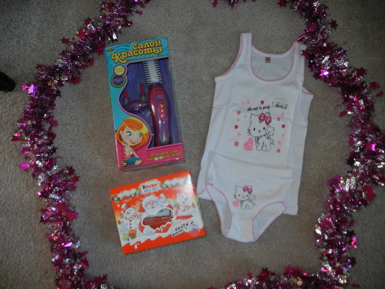 Для дочки фечка подарила наборчик маечка/трусики, очень хорошего качества, игрушку для завивки волос, набор Киндер шоколад - ее любимый, конечно)) и мишуру она утащила уже в свою комнату, украсила зеркало.