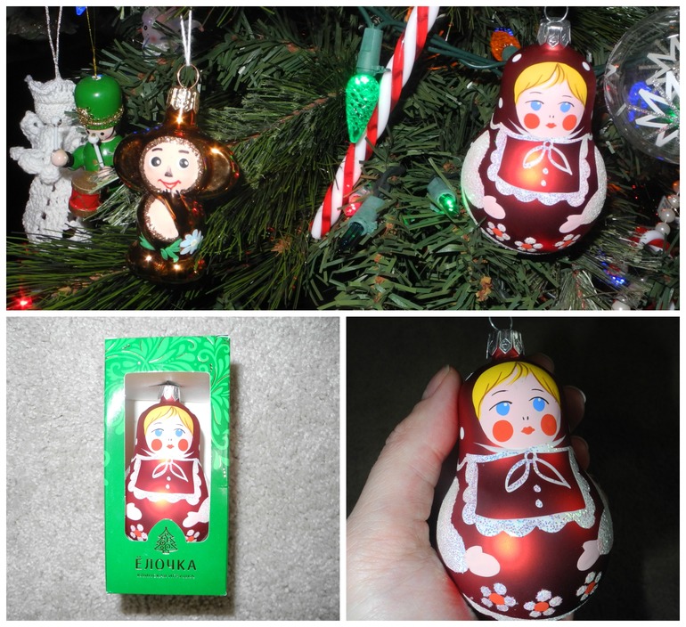 В прошлом году Светочка мне подарила игрушку на елку Чебурашку, но посылка долго шла и мы уже разобрали елку к тому времени, а сейчас у нас есть еще и матрешка , вот они уже вместе заняли свои места на елочке