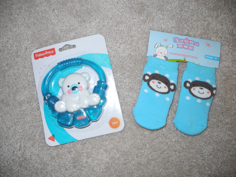 Нашему сыночку-пузожителю тоже подарочки есть - носочки с символом 2016 года обезьянкой и прорезыватель