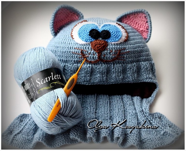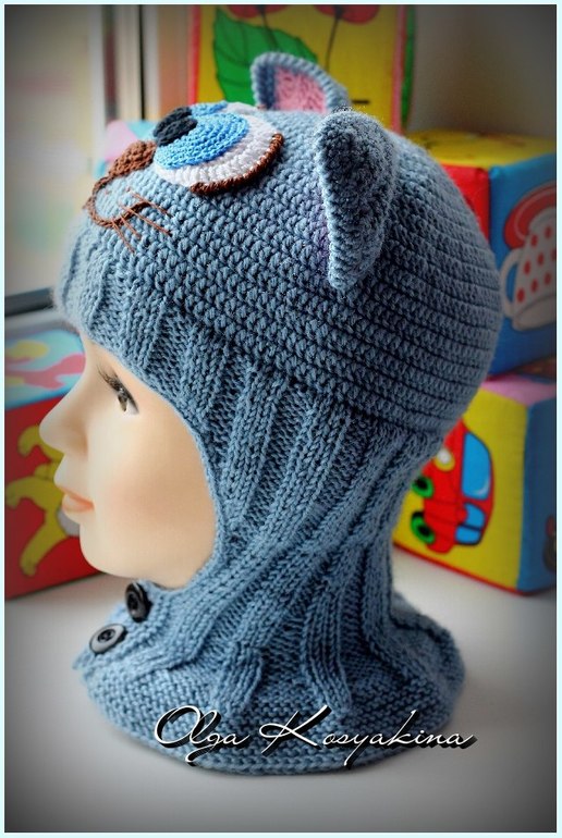 Тулью шапочки вязала крючком 2,5. Далее перешла на круговые спицы, резинка 3х3. Довязала до бровей и закрыла петли на средней части шапки для лба, далее вязала поворотными рядами, в каждом лицевом ряду убавляла петли с краев для скосов ушек. на линии подбородка с обеих сторон использовала частичное вязание для наилучшего прилегания к шее. Прибавки на манишку делала так - в каждом лицевом ряду прибавляла по 2 петли к изнаночным петлям резинки, полотно расширилось. И в завершение платочная вязка, и планочки с отверстием для пуговиц.