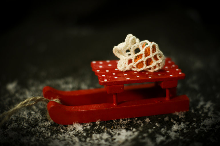 Долго блуждали они средь заснеженных деревьев в поисках самой красивой ёлки, для которой они на своих саночках везли маленькие украшения к Новому году.