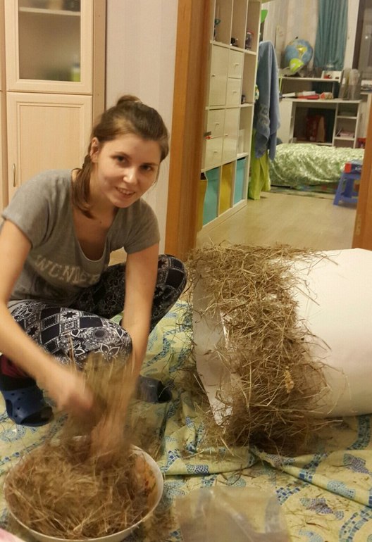 Вот такую задачку мне задали. Ребенок играет фермера и понадобился стог сена. Голову ломала долго, но в итоге все оказалось просто)) Болванка из ватмана + нарезка листов, чтобы закрыть "крышу". Много клея момент прозрачного, сено для кроликов, лак для волос (за 55 руб), что бы сено не рассыпалось, и веревка.