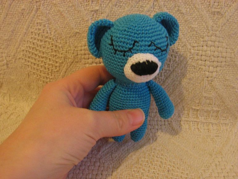 Мишка вот. Вязался для малыша 6 мес., поэтому минимум отрывающихся деталей. Цвет выбирала заказчица. Внутри погремушка