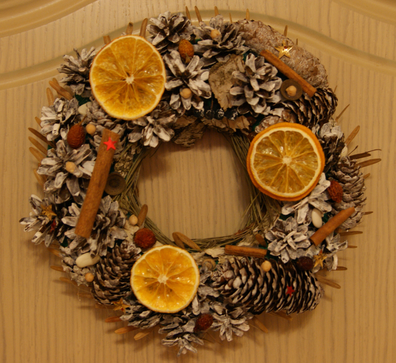 И я, наконец, соорудила новогодний веночек ) Вырезала кусок пенопласта (благо этого добра у нас после переезда полно еще), обернула крепированной бумагой. .Украшала всем, что в доме нашла. Шишки, кусочки коры, сушенные апельсине, сосновые иголки, самолетики от клена, шляпки от желудей, нут, фасоль, корица, шиповник, черноплодка. Шишки покрасила пропиткой белой, которая тоже от ремонта осталась.