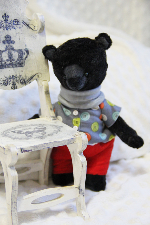 Мишаня, уже по проверенной выкройке "чернышей", 19 см ростом, опилки, гранулят, шплинты и винтажный плюш...наряжен для встречи НГ...правда встречать его он будет скорее всего в пути...