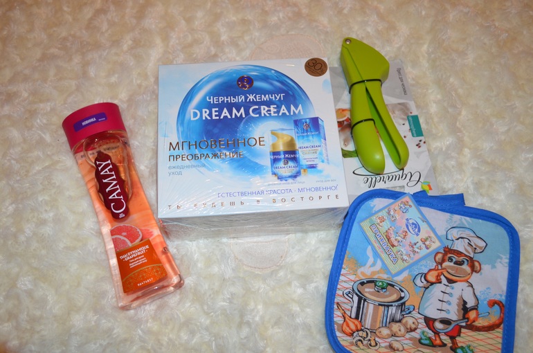 Это подарочки для меня: Прихваточка с обезьянкой-символом Нового года, косметический набор, классный гель для душа и суперская чесночница! Спасибо Олечка, все очень нужное и классное!