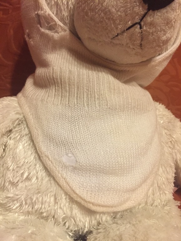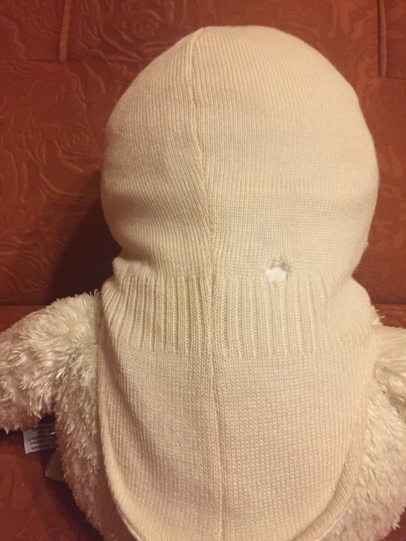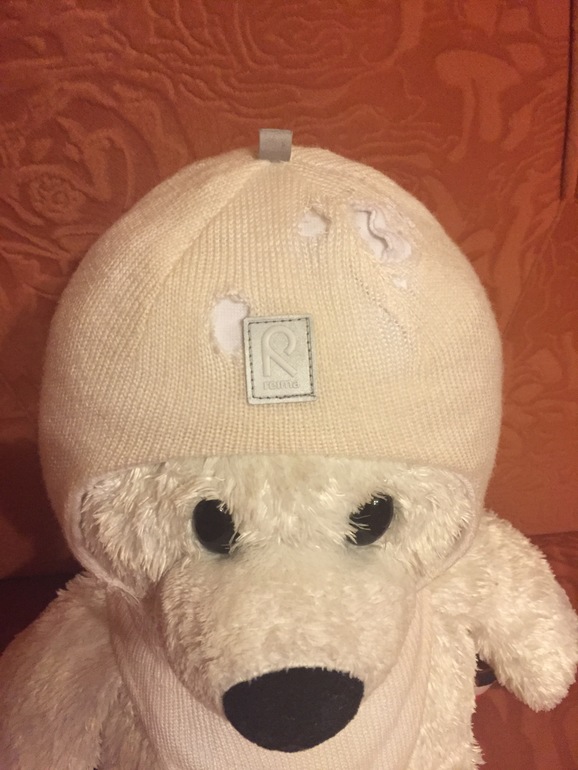 Закинула в стирку шлем детский Рейма. Достала нечто рваное и ужасное. До этого его неоднократно стирала, но такого не было. Расстроилась сначала, выкидывать не стала. Решила проявить фантазию и заштопать дырки мишками.
