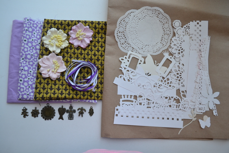 Для блокнотика: ткань (3 отреза), ленточки тоненькие атласные, подвесочки, цветочки, вырубка
