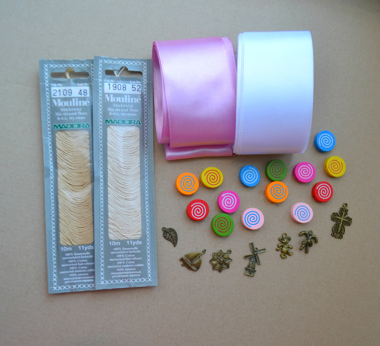 Лента атласная 2 шт (5см) по 3 метра, бусины деревянные, подвесочки, нитки для вышивания.
