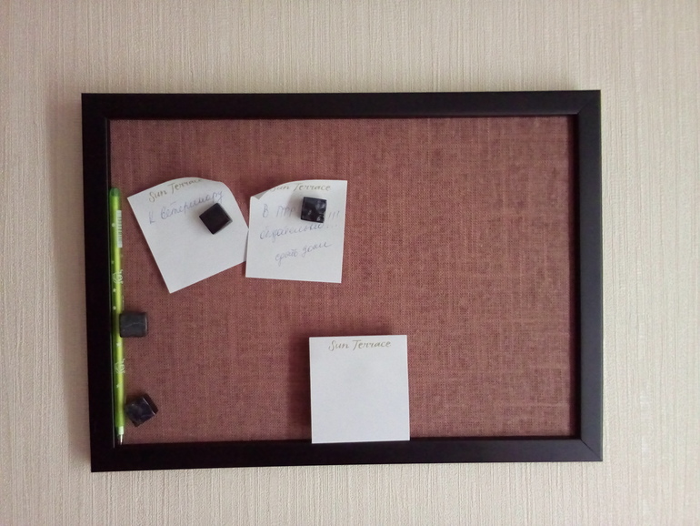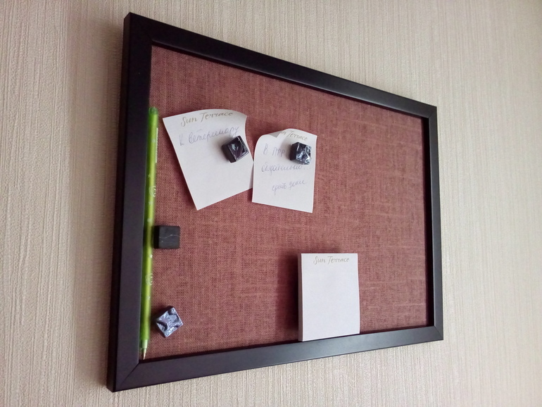 Из материалов: лист металлический из старой доски, старая рамка для фото, лист картона пивного 2мм, флизелин, лен, подареный подругой, блокнотик от нее же, магниты неодимовые, мозаика, оставшаяся от ремонта друзей, старая ручка и скотч двухсторонний и 2 часа драгоценного времени!