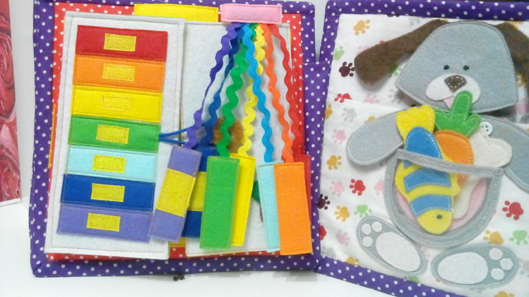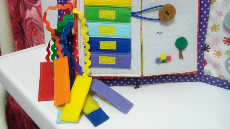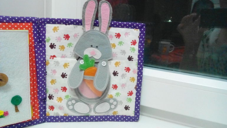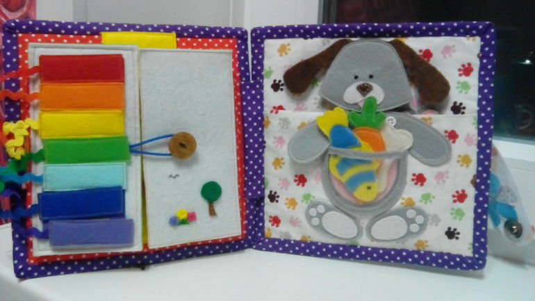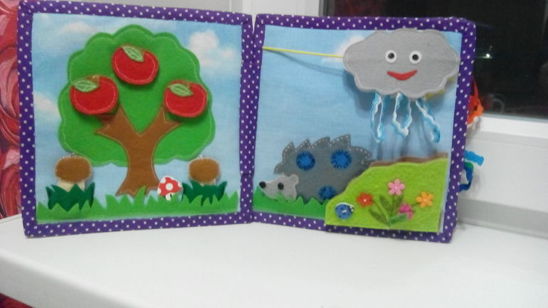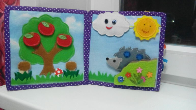 Книжечка шилась долго и с большими перерывами: то поиск материалов, то идей для воплощения.. Некоторыми страничками мы играем уже с 7 месяцев (по фото их видно), но настолько они нравятся ребенку, что мне дошивать книжку приходилось во время ее сна - иначе дочка сразу же отбирала их у меня и не отдавала!
