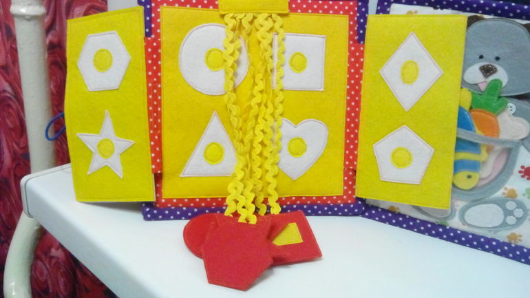 Фигуры специально выполнены в одном цвете чтобы ребенок научился отличать именно форму предмета. Пока они так же на лентах. Без лент на этапе пошива выглядело куда эстетичнее, но пока так. Потом их тихонечко уберем и оставим красоту