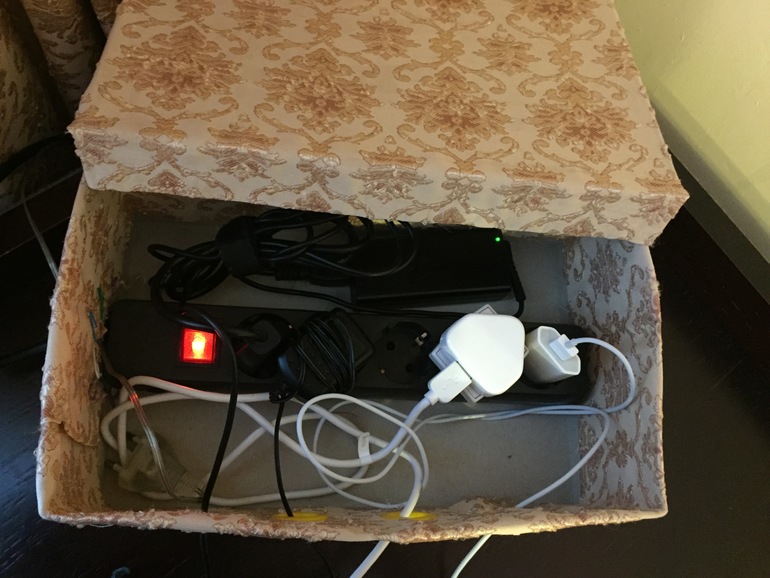 Отмечаем, вырезаем, клеим, скрепляем, сушим. Внутрь коробки поместила удлинитель, провод которого выходит сбоку. Помещаем в коробку нужные нам зарядные устройства.