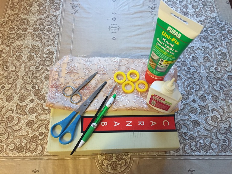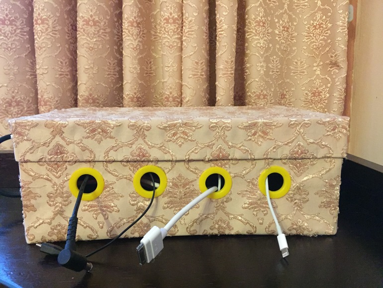 Мы живём в такое время, когда у нас очень много различных гаджетов, которые периодически нужно заряжать. У каждого из них есть своё зарядное устройство. Я решила сделать коробку, куда поместила зарядники от телефонов, планшета, ноутбука. Теперь не нужно их перекладывать с места на место, искать. Да и просто выглядит это эстетично. Для изготовления мне понадобилась коробка из под обуви, отрезок ткани (я использовала обрез от штор, коробка получилась ещё под интерьер), люверсы (я использовала тоже из обувных коробок, сбоку бывают), клей ПВА, ножницы, ну и различные вспомогательные элементы - ручка, кисточка, скрепки.