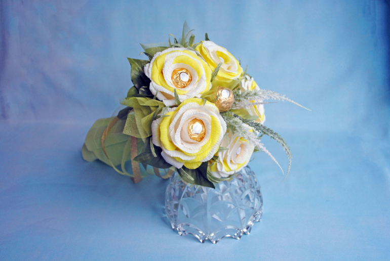 Букет из конфет, миник "Розовая мечта". Сделала немного хризантемок