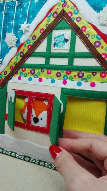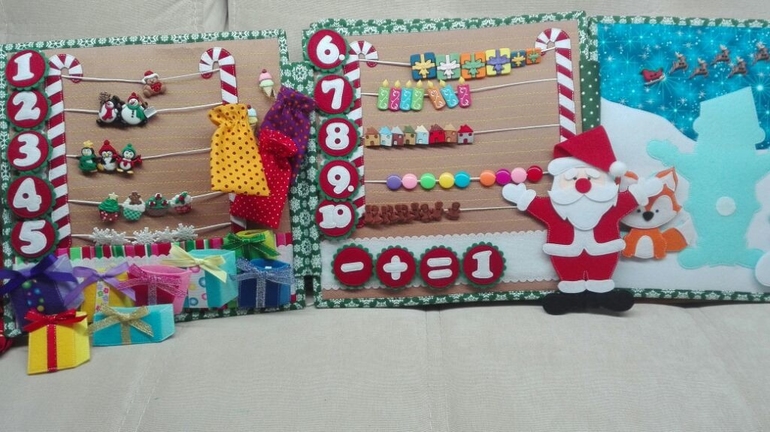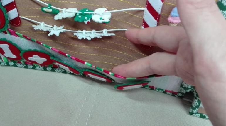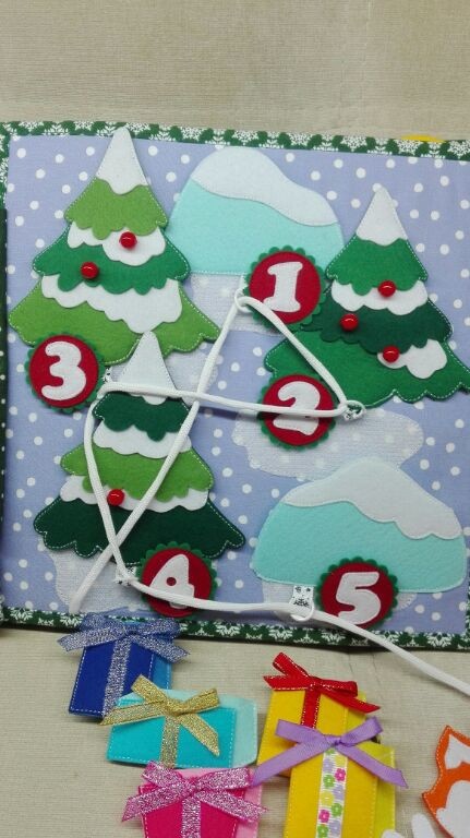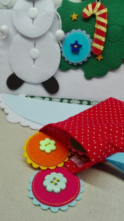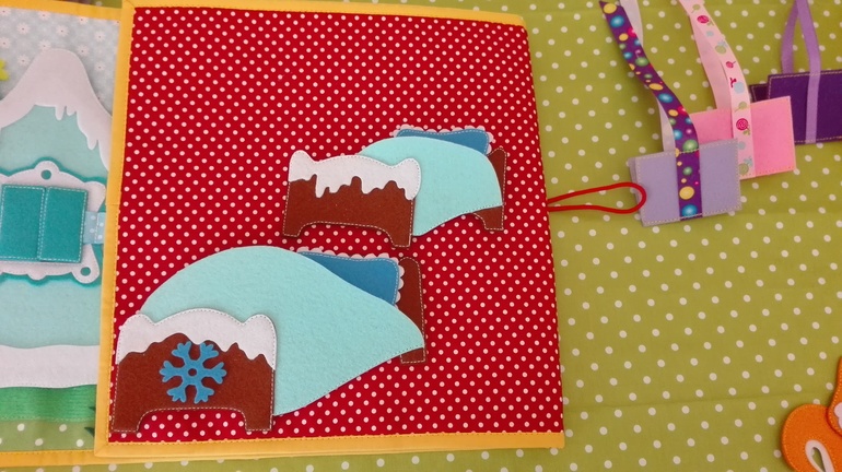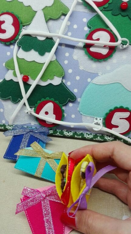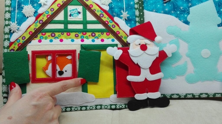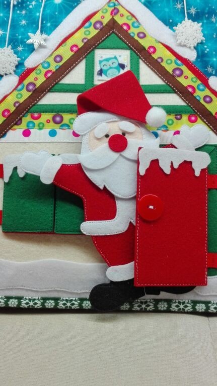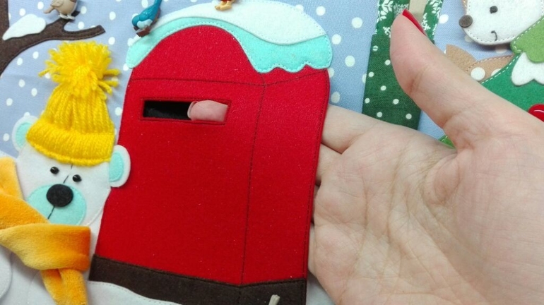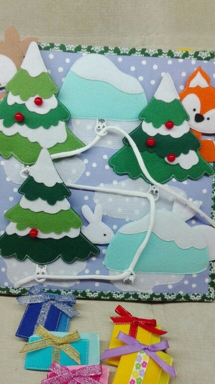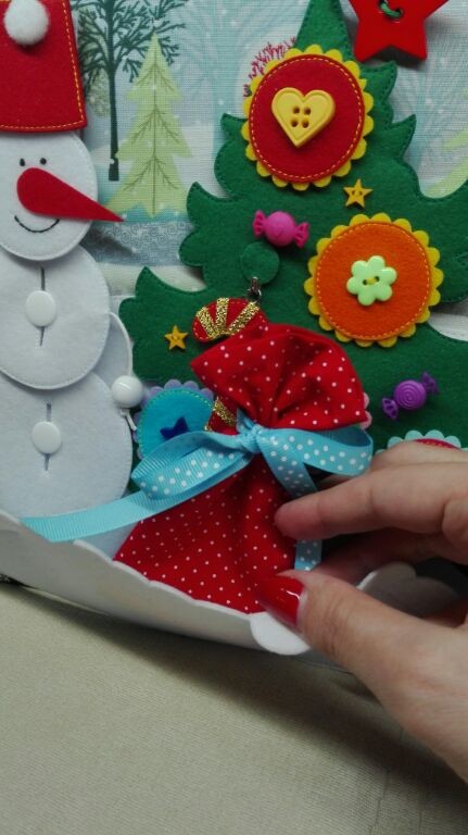 Фабрика подарков)мешочки вешаются, подарочные коробки крепятся на ленту велкро, в полосатом кармане должны лежать письма.