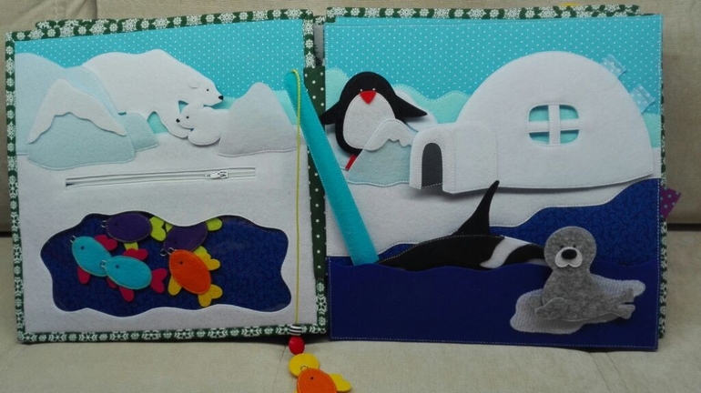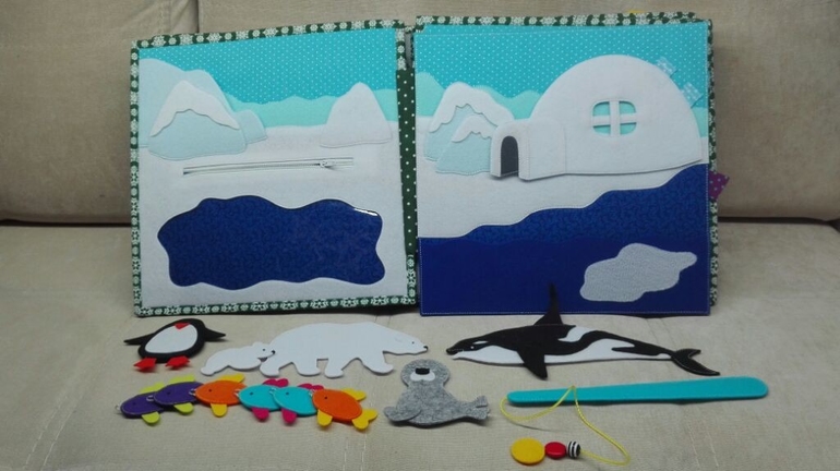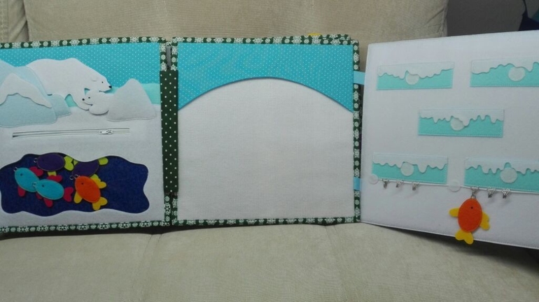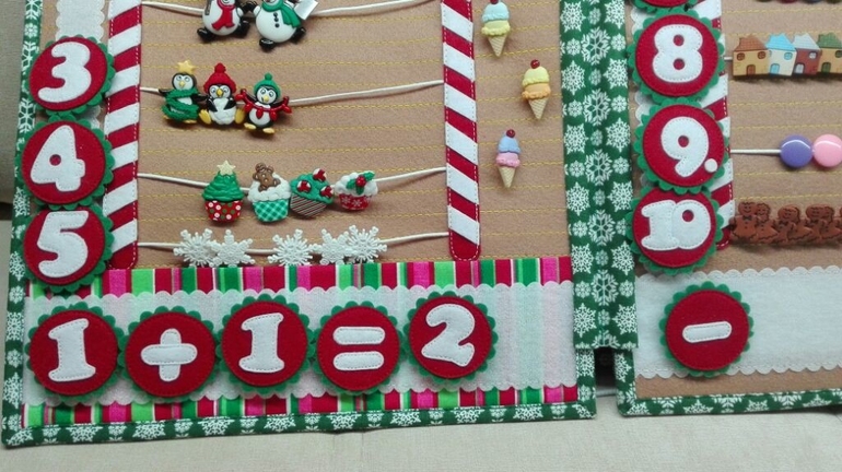 Белый фон-это ткань велкро, сюда должны крепиться кроватки белых мишек с подушками и одеяльцами, на кармашках должны быть съемные цифры.