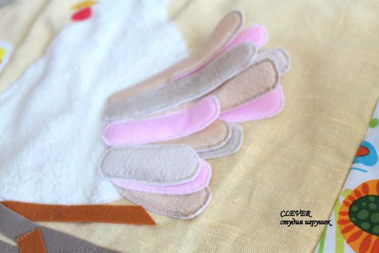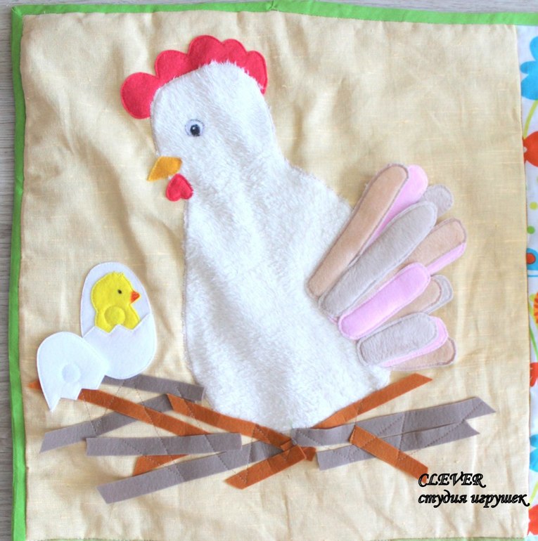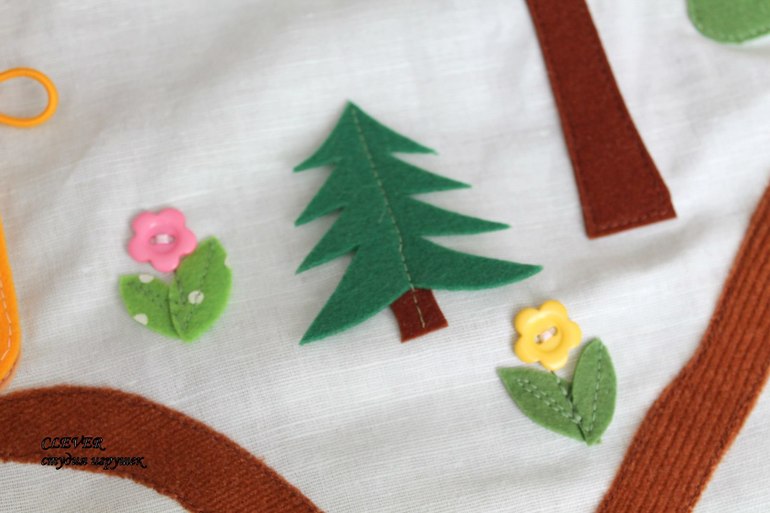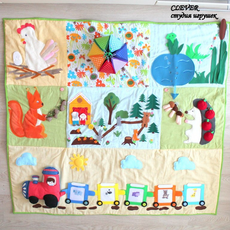 Разнофактурные материалы, разные виды застежек, бусины - все необходимое для развития вашего малыша есть в развивающем коврике.