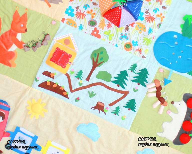 В итоге, у меня получился совершенно отличный от автора коврик. По моей задумке два героя - мальчик и девочка (можно придумать имена самостоятельно) помогут малышам освоить фигуры, цвета, животных нашего леса, животных саванны, счет, явления природы и насекомых. Малыши смогут разыграть сказку "Колобок", познакомиться с белкой и ежиком, лягушкой и курицей, покататься на поезде с Мишей и спрятаться в цветке вместе с Машей.
