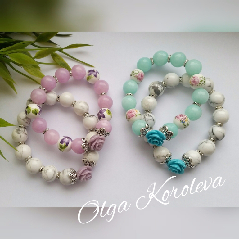 Комплекты для маленьких подружек в одном стиле. Кахолонг, тонированный агат, керамические бусины с рисунком, розы из коралла. Браслеты на двойной резиночке.