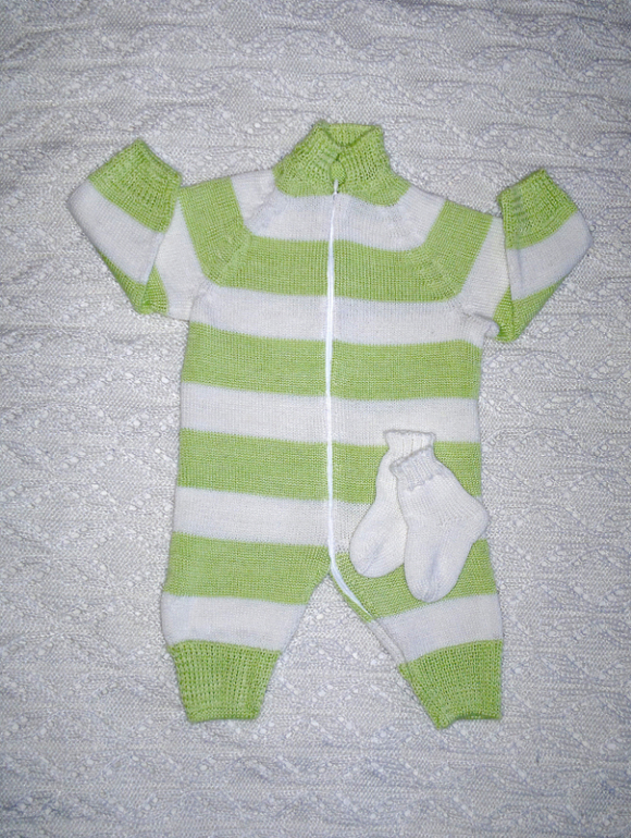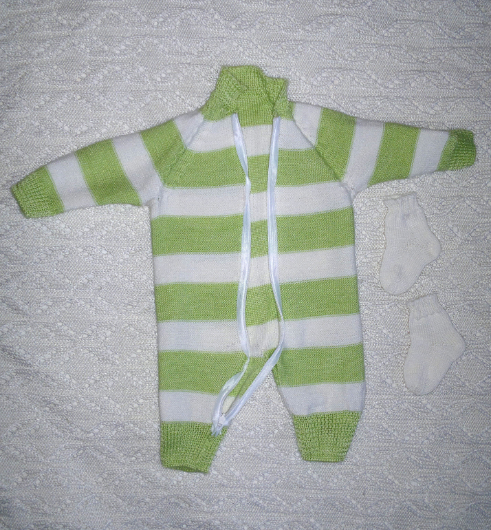 Комбинезон в нежно-зеленую полоску и носочки для новорожденного. Связан традиционно без швов. Белорусская п/ш, размер 56-62.