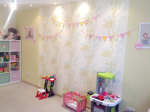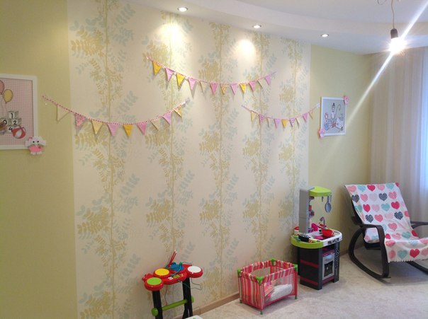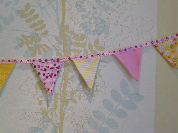 На скотч не смотрим, он временно, пока присматриваюсь как лучше повесить, да и по середине будет дочкина фотография тоже в белой рамке 40 на 50. Обои на этой стене меня всегда раздражали, совсем не детские (3 другие стены светло желтенькие), но пока нет возможности их поменять, как только так сразу сделаем. А пока решила хоть как то добавить детскости стене, вот сшила гирлянду, точнее 3 их получилось. Они односторонние, с обратной стороны просто байковая бежевая пеленка, ткани просто уже не хватает)