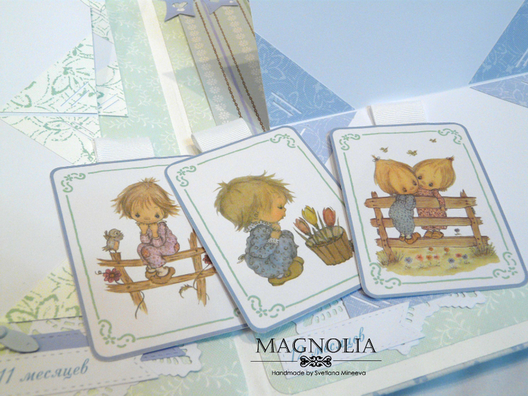 Альбомчик получился достаточно простой , но на мой взгляд хорошенький и крепкий. Формат А4, 5 разворотов, переплет по МК Виноградовой. Вмещает в себя 43 фото 10*15 см, кармашки для бирочки, фото узи, таблички для записи веса, роста, зубок, основных достижений. Для каждого месяца, беременности, крещения предусмотрены большие теги для записей. Картинки с детками использовала в качестве тегов, на обороте есть разлиновка для записей