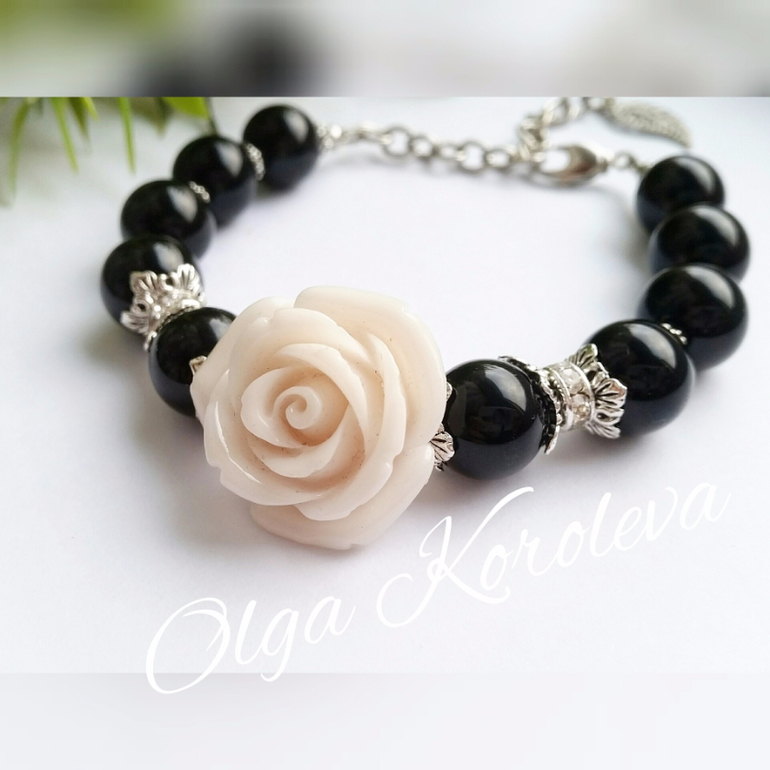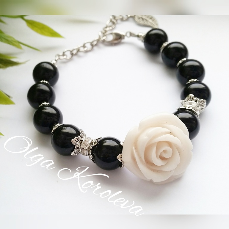 Вчера родился этот браслет: из крупного черного агата с резной розой из коралла молочного оттенка. Фурнитура под серебро и милые ронделлы со стразами.