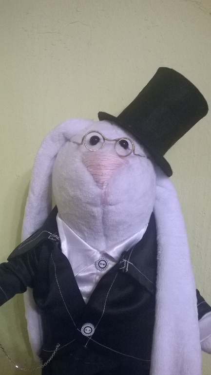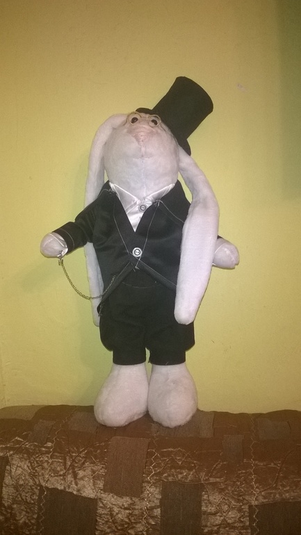 Дошила его наконец-то. Такой важный господин с брюшком. Обувь делать не стала, хотя подумываю об этом. Рост у зайки 45см. В общем смотрите.