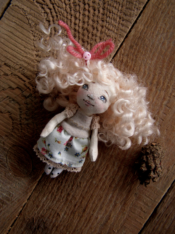 Игрушечный мир - животныеСовсем малышка.Белокурая девочка в ладошку...Сшита из небеленного хлопка..одежка из хлопка, хлопкового трикотажа и кружев. Под платьишком колготочки в горошек. Личико расписано акрилом и маслом.На спинке крепление под бронзу). Девочка-талисман. Она самый верный и настоящий друг). Внимательно слушает и умеет хранить секреты). Размерчик 8см. Немного подробнее под катом)