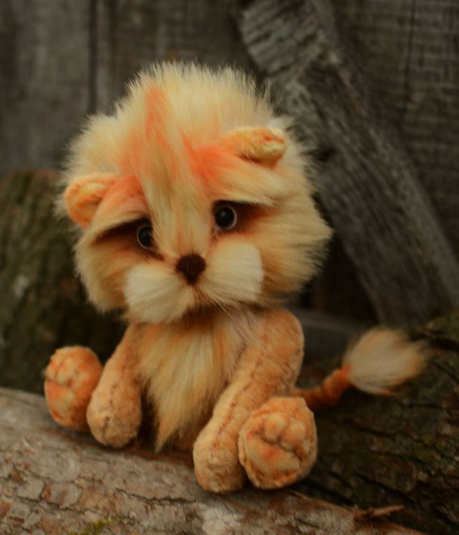 Игрушечный мир - животныеЛьвенок сшит из винтажного плюша и немецкого мохера, пяточки и ладошки миништоф, глазки стекло, мордочка оформлена стрижкой, тонирован маслом. Рост стоя 19 см, стоять не любит, сидит сам, приятно тяжеленький.