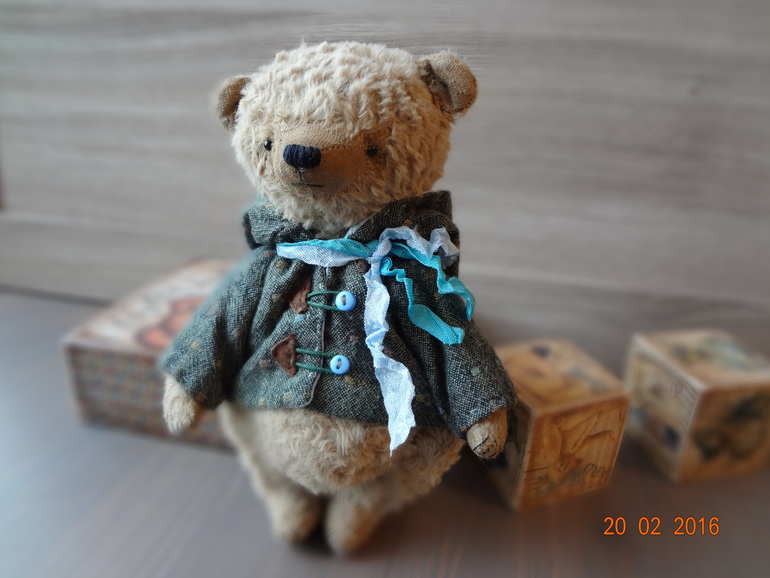 Тедди: мишки и их друзья.Сегодня появился на свет мишутка по новой выкройке.. Знакомьтесь Павлик. Рост 18см. Сшит из немецкой вискозы,набит плотненько опилочками,утяжелен стальным гранулятом,сидит уверенно сам,стоит с поддержкой. Шплинтовое крепление,стеклянные глазки. Одет мишка в стильный пиджачок из японского хлопка,на шее шарфик из шеби ленты. Мишка тедди сшит полностью вручную в единственном экземпляре.