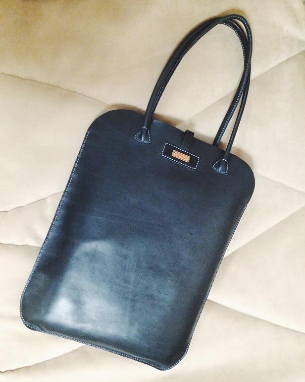 Тонкая сумка сшита вручную из темно-синего краста,покрыта,отполирована. Прошита голубой вощеной ниткой. Застёжка -кобурная кнопка. Размер -29,5см*39см(с лямками высота-59см). Стильная. Удобная.