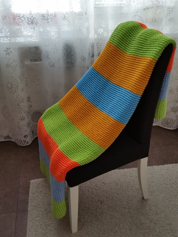 Пряжа помпонная называется... схемы нет никакой просто набрала 100 петель и вязала каждый моток весь, выходило по 32 ряда, с каждой стороны по 16 помпончиков ,так как плед двусторонний вязать только лицевыми связала 11 мотков разных цветов ) если вязать лицевой и изнаночной то будет односторонний так не очень красиво будет .... по мне так очень большой получился надо было поменьше вязать ) вяжется очень быстро и легко ...
